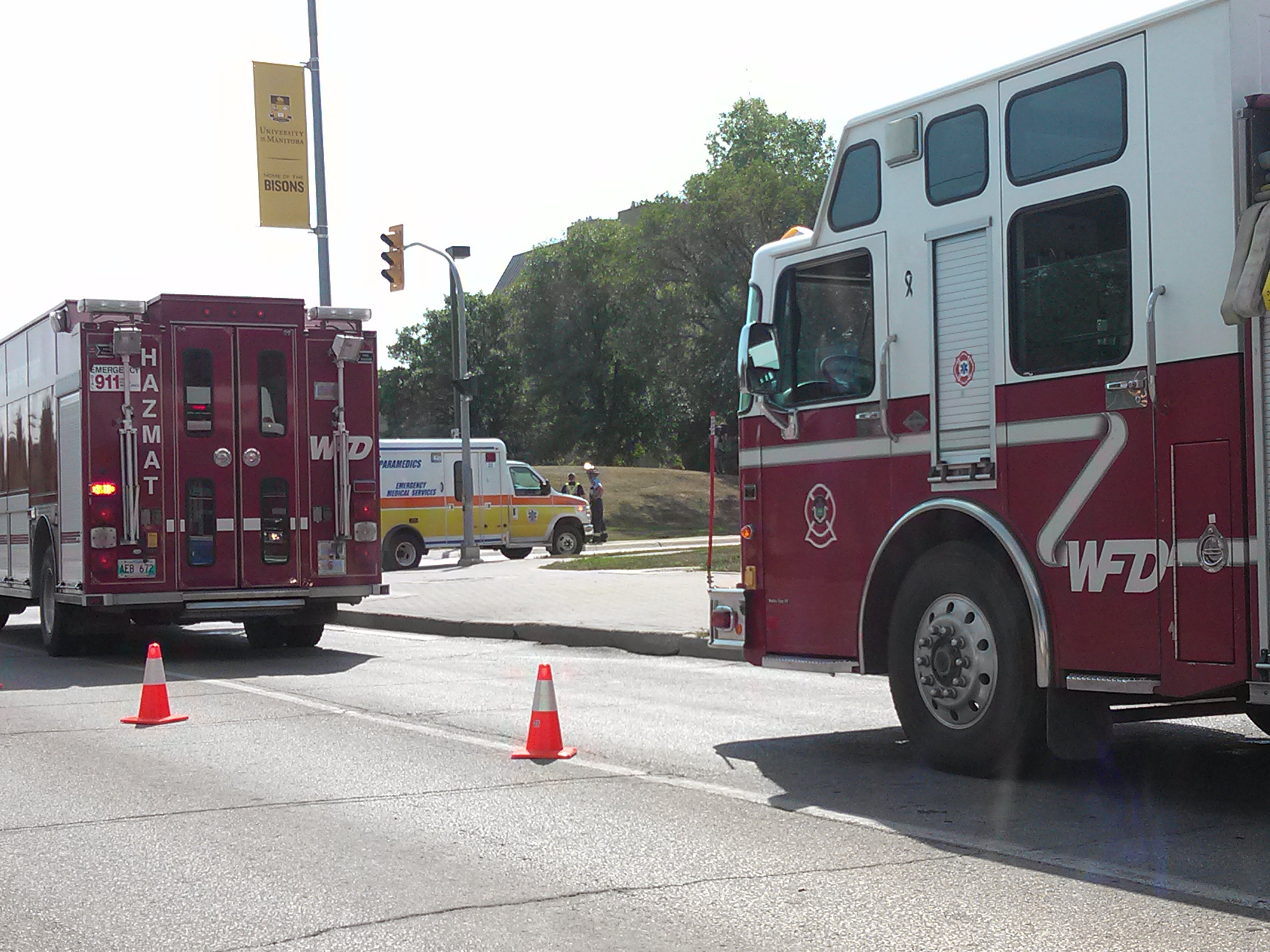 A fleet of emergency vehicles converged at Dafoe and University Crescent at approximately 1:30 today, Aug 27.