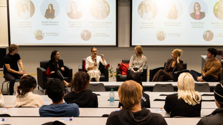 The panel included four women — Maddie Thompson, the founder and CEO of MAD Social, Charlotte Vis Van Heemst, who leads student success and strategic initiatives at Asper school of business, Brenda Gibson, president and CEO of Red River Mutual and Chelsea Arns, who leads TutorBright Prairies.