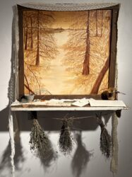 One standout canvas, “From the Western Wind,” was framed in wood and lace with a windowsill at the bottom, giving it the sense of looking out a cabin window at the snow-covered trees in the painting. The windowsill was topped with real pine needles, rosehip, sea glass, an envelope, a card and a stone cup. Dried bunches of thyme and rosemary hung beneath it. Gertzen revealed that the trees took until the day of the show opening to finish painting.
